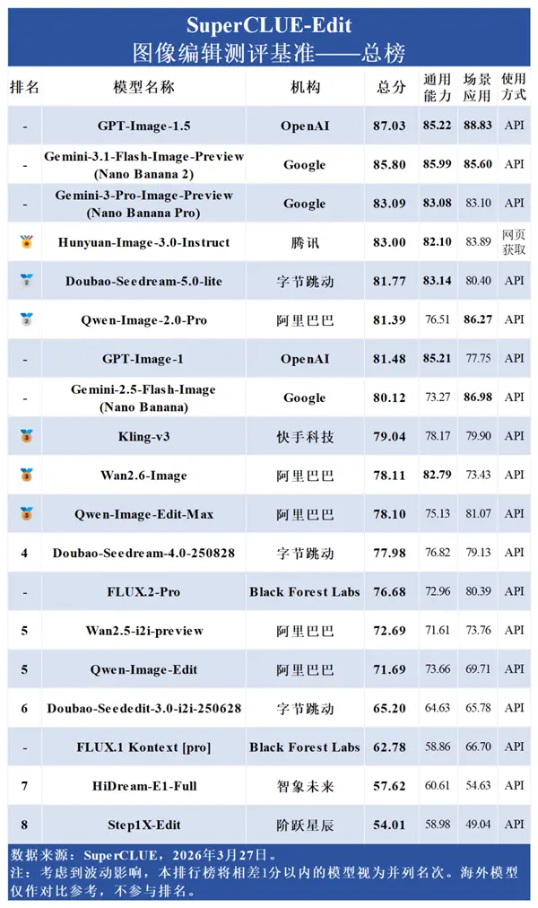 SuperCLUE日前发布2026年3月中文原生图像编辑测评榜单,本次测评覆盖国内外19个主流图像编辑模型,从通用能力与场景应用两大核心维度展开全面评估。结果显示,OpenAI的GPT-Image-1.5以87.03分稳居总榜榜首,腾讯Hunyuan-Image-3.0-Instruct以83.00分拿下国内第一,字节、阿里等国产模型紧随其后,形成紧追海外头部的第一梯队。