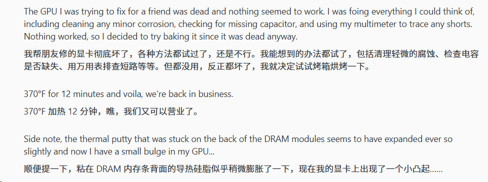最终他将显卡送入家用烤箱,在188°C下烘烤了12分钟,显卡在取出重新组装后成功点亮。