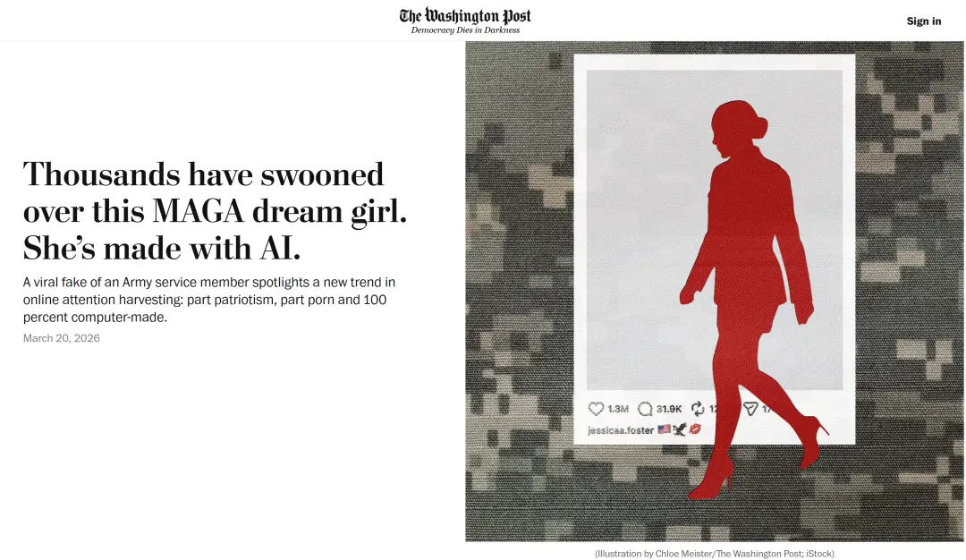 3月20日,《华盛顿邮报》披露,这个账号从头到尾都带着典型的 AI 破绽:美国陆军查不到Jessica Foster的服役记录。