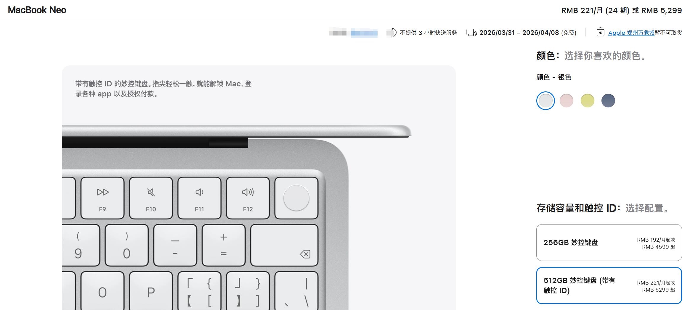 网友发现,苹果京东自营店的MacBook Neo已经处于卖断货状态。而在苹果官网,虽然256GB版本在部分零售店尚可取货,但512GB版本已供不应求。目前512GB版本的订单最晚发货时间已经排到了4月份,这种火爆的销售态势,反映出市场对苹果入门级笔记本的强烈需求。