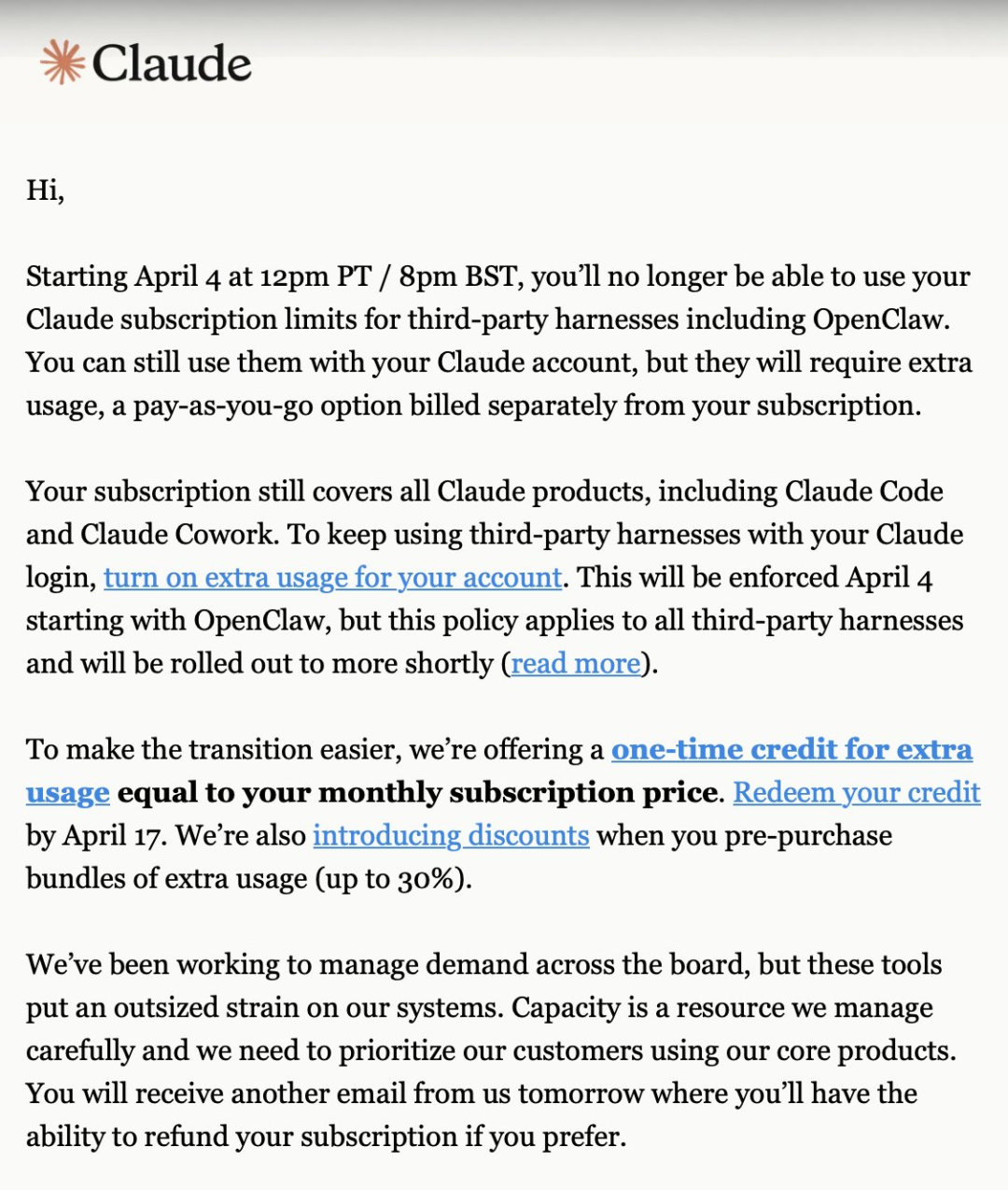 Anthropic给成千上万OpenClaw用户发出通知:明天起,你的Claude订阅额度不能再给OpenClaw用了,想继续,那就按量计费吧。