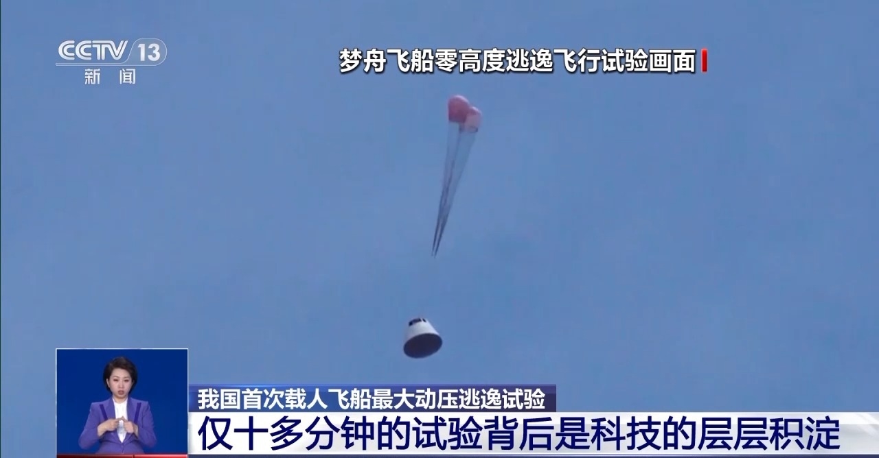 从开始逃逸到落入海中,飞船最大动压逃逸试验飞行时间共持续约13分钟。