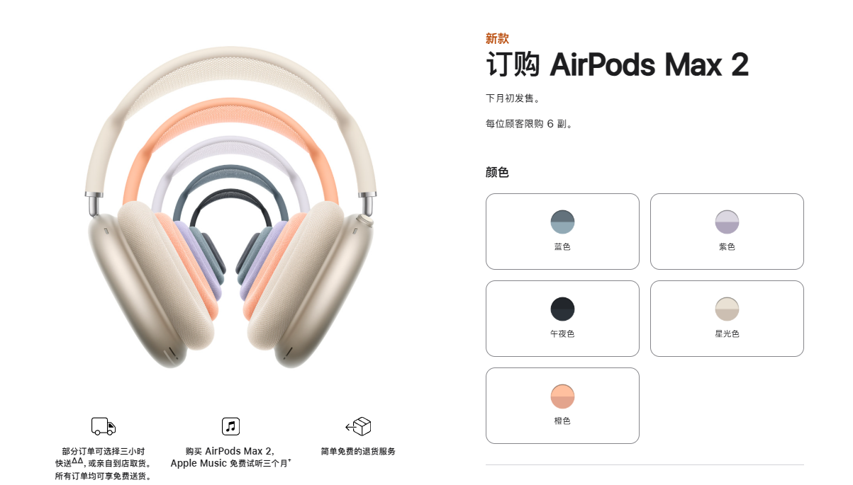 苹果在3月16日突然发布了AirPods Max 2头戴耳机,售价3999元,今晚已经正式开始接受订购,将于4月1日发货。AirPods Max 2整体外观设计没有任何改动,提供午夜色、星光色、橙色、紫色、蓝色五款配色,重386.2克。