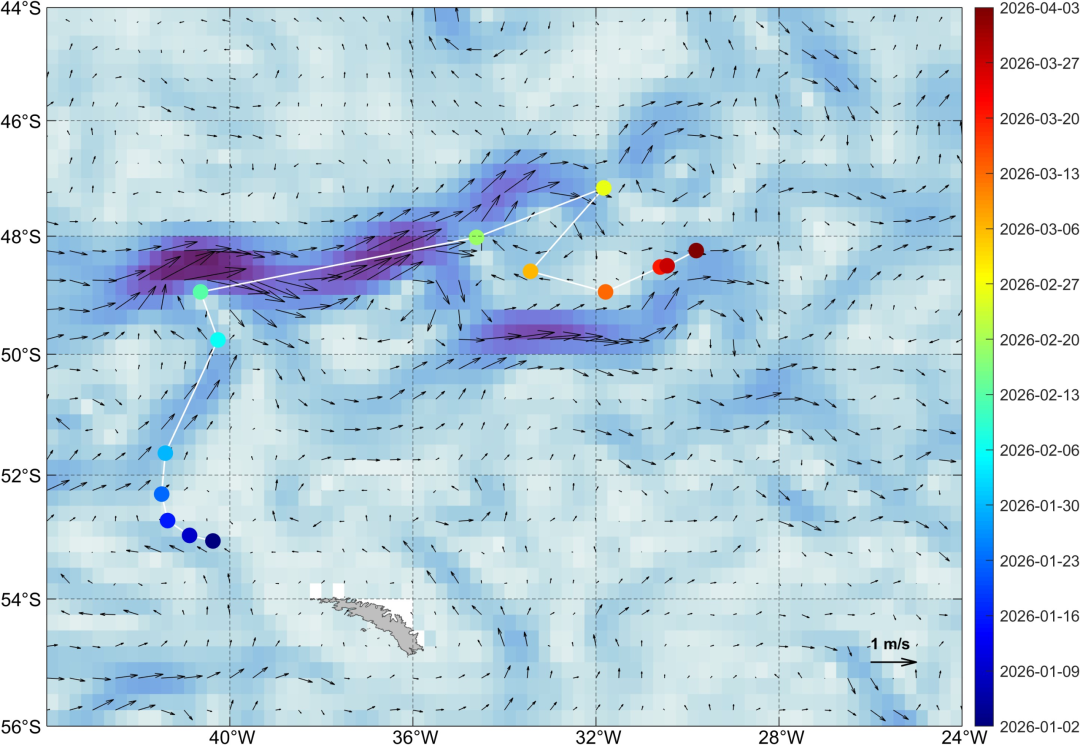 基于风云卫星监测的A23a冰山漂移路径(圆点为冰山位置,时间与右侧标注对应;图底色和箭头表示洋流)