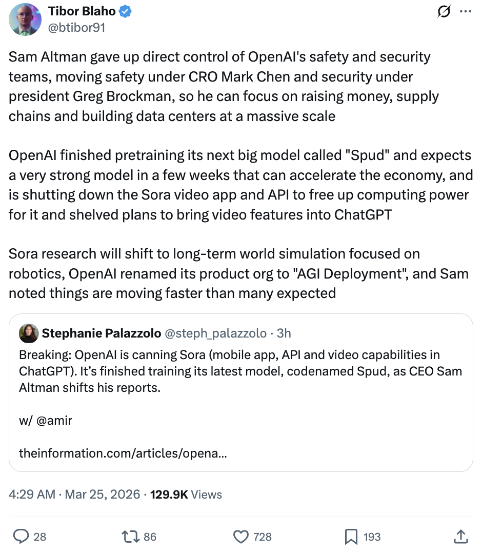 OpenAI已完成其下一代大型模型“Spud”的预训练,预计在几周内推出一款性能很强的模型。正是为了为这款新模型腾出算力资源,OpenAI决定关停Sora,同时搁置将视频功能接入ChatGPT的相关计划。