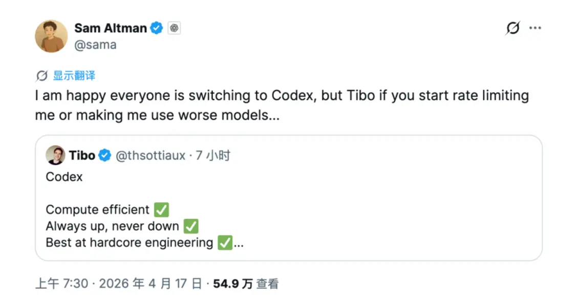 Sam Altman 似乎也终于从袭击的阴影中走出,还有空在社交媒体上调侃 Codex 负责人 Thibault Sottiaux,“我很高兴大家都在转向 Codex,但是 Tibo,如果你开始限制我的速率或者让我使用更差的模型……”