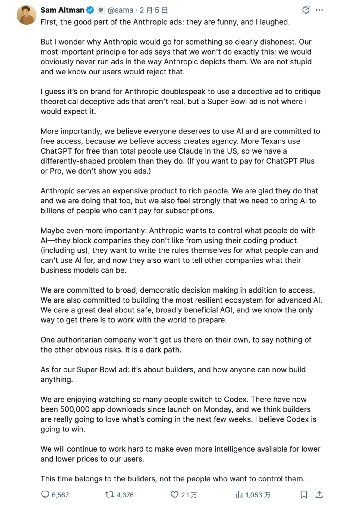 Sam Altman 不打自招,愤而在 X 上更新一条数百字的推文,强调“我们显然不会以 Anthropic 描绘的方式投放广告”。他称,用一则带有误导性的广告去批评那些根本不存在、只是假设中的误导性广告,的确很符合 Anthropic 一贯的双重标准。