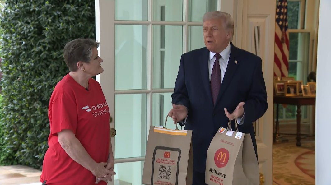 来自阿肯色州的莎伦·西蒙斯身穿一件红色的“DoorDashGrandma”T恤衫,在媒体的注视下,拎着两袋快餐敲门。特朗普应门,并在西蒙斯的陪同下,回答了记者们关于各种话题的提问。西蒙斯表示,1月份取消小费税后,她省下了一大笔钱。