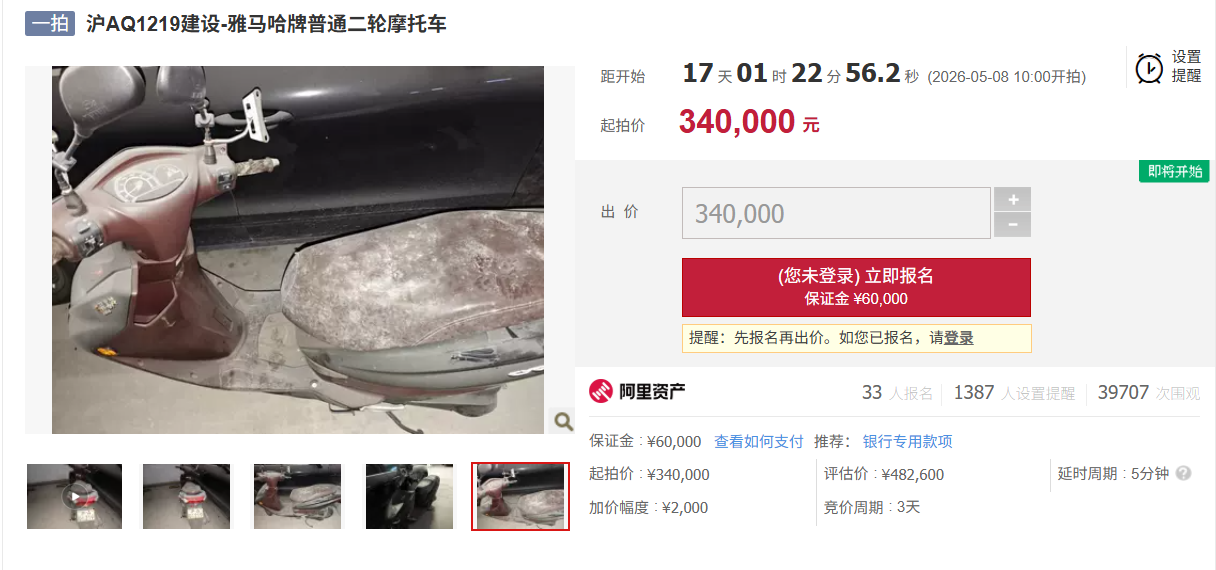 近日,阿里资产拍卖平台显示,一辆“沪A黄牌”摩托车将于5月8日上午开拍,起拍价34万元。资产评估报告显示,2025年7月前后,该摩托车主体的评估净值为2500元,而车牌的评估净值达48万余元。