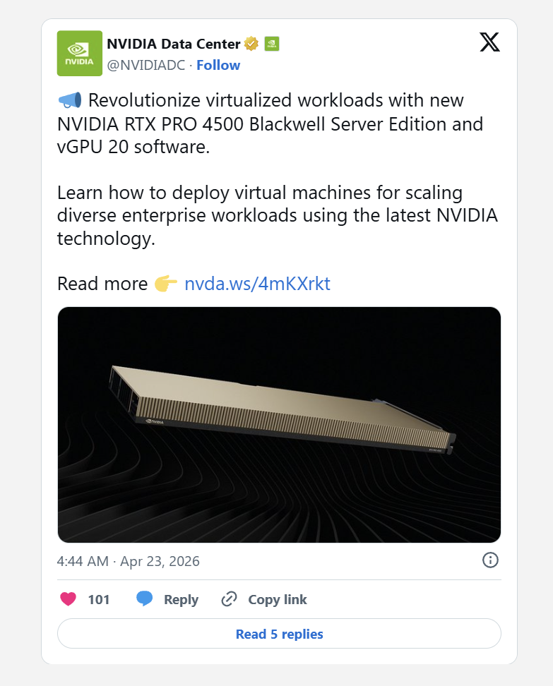 应用场景上,该卡主要面向企业级虚拟化工作负载,搭配vGPU 20软件可实现高效的虚拟机部署与管理,适用于专业图形工作站虚拟化、AI模型开发与推理、数据中心高密度计算、企业级3D渲染与设计,以及虚拟桌面基础设施部署。