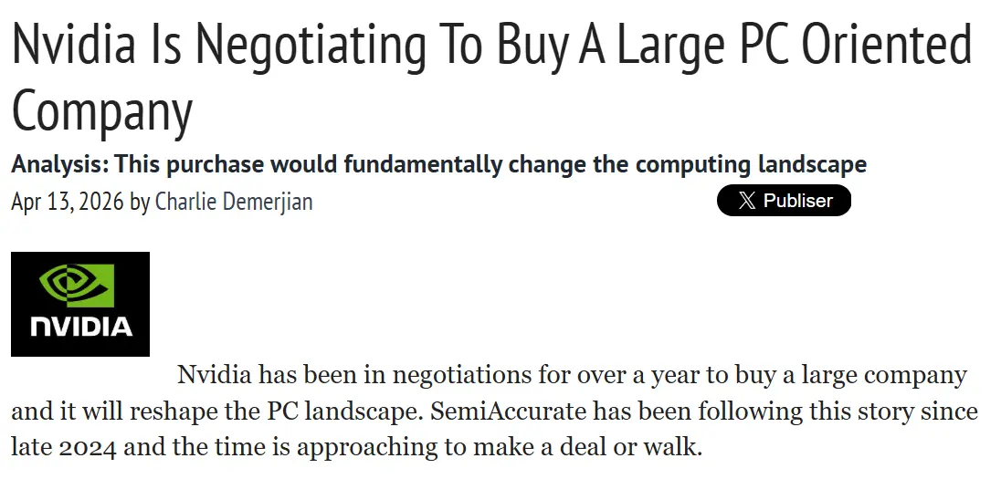 SemiAccurate称,英伟达已就收购一家大型公司进行了超过一年的谈判,此举将重塑PC产业格局。SemiAccurate还表示自2024年以来一直在跟踪这条线索,现在这笔交易已经“接近达成交易或放弃的关键节点”。