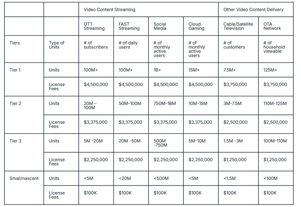 新费率按平台类型和规模分为三个等级,Tier 1级别涵盖订阅用户超1亿的OTT服务、日活超1亿的FAST服务、月活超10亿的社交媒体平台以及月活超1500万的云游戏平台,年费为全额450万美元。