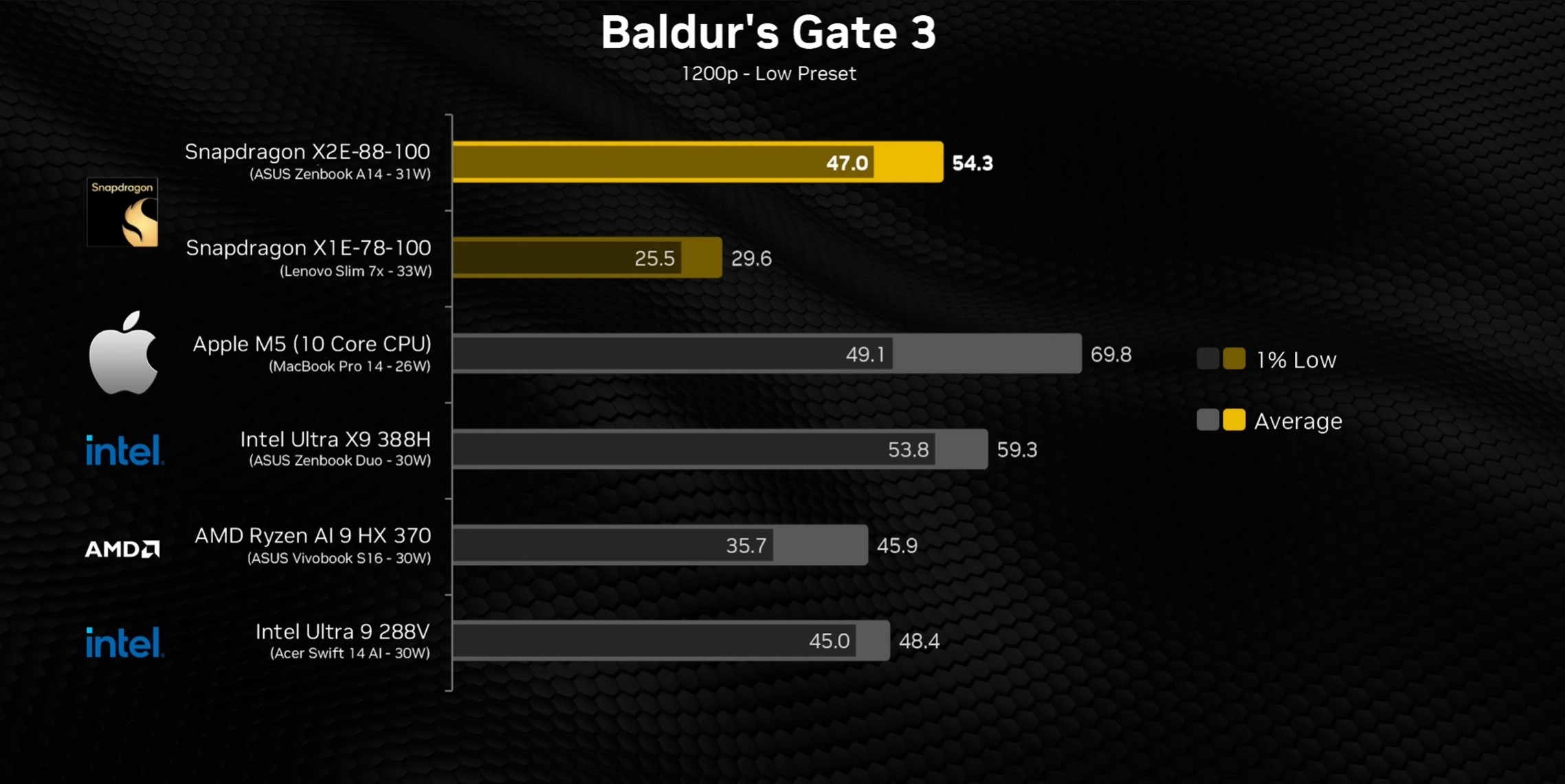 骁龙X2 Elite -平均帧率54.3FPS,1%低帧47FPS(较骁龙X Elite平均帧率提升83.4%,1%低帧提升84.3%)