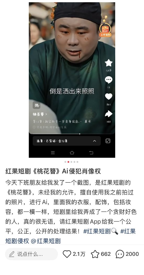 近日,一位汉服妆造师在社交平台发文称,红果短剧《桃花簪》未经允许,擅自使用其之前拍过的照片,并通过AI处理,侵犯其肖像权。该用户表示,“里面我的衣服、配饰、包括妆容都一模一样,短剧里给我弄成了一个贪财好色的人,真的很无语,请红果短剧App给我一个公平、公正、公开的处理结果。”