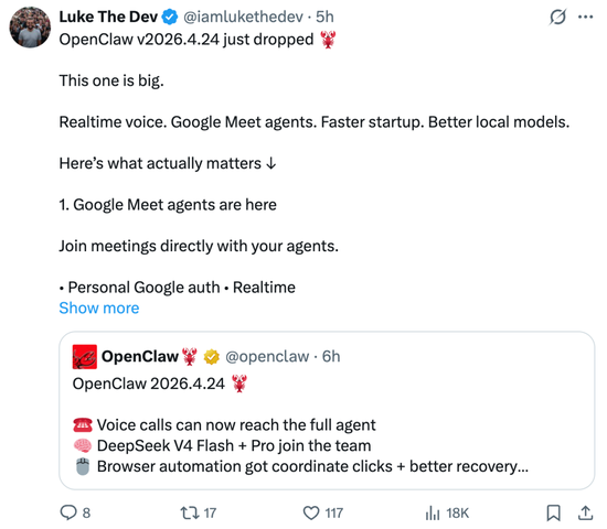 在 DeepSeek V4 发布两天之后,OpenClaw 再次迎来更新,完成了对该系列模型的适配接入。今天凌晨,OpenClaw 发布了‘2026.4.24’版本。
