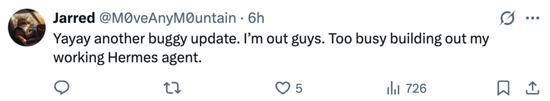 还有人表示,‘又是一个全是 Bug 的更新。兄弟们我不陪玩了,我很忙,要去折腾我那个能跑通的 Hermes 智能体了。’