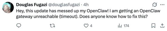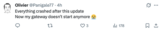 很多人反馈,更新完后,整个系统全线崩溃,核心的‘网关’完全无法启动。