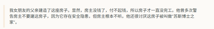 苏斯博士是美国著名的儿童作家,想象力丰富,写过很多天马行空的童话故事,木楼和他联系在一起,一点不违和,因为这座木楼太奇幻了,像是从苏斯博士的童话故事里走出来一样。