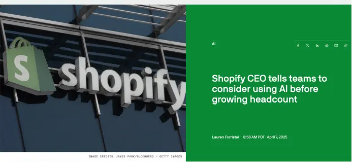 Shopify虽然没有大规模裁员,但让许多岗位的JD不再出现在招聘市场上,如ur初级岗位、重复性岗位和支持性职能。此外,Shopify还在内部强调,AI可以让团队完成更多的工作,甚至带来百倍的效率提升。