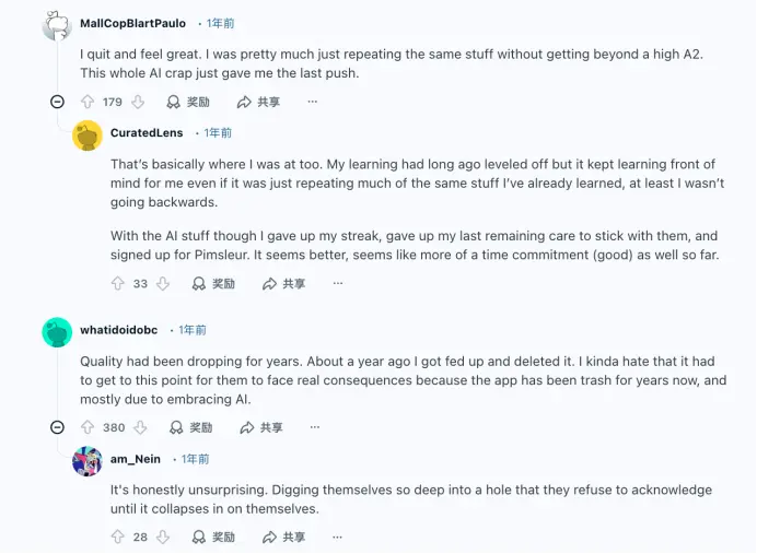 2025年,多家媒体(如Customer Experience Dive,Polygon等)均提到,用户开始集中反馈课程质量层面的问题,诸如“AI生成的句子‘不自然’、‘像机器拼接’”“练习内容重复、语境不真实”和“部分语言课程质量波动明显”。