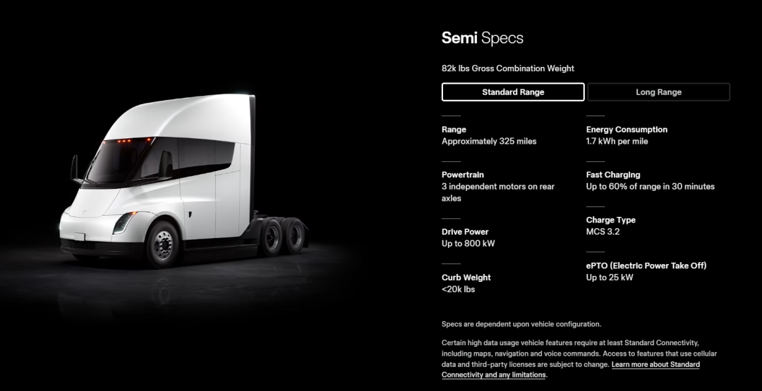 在新界面中,特斯拉将Semi分为标准续航版和长续航版,并更新了两款车的最新生产规格。
