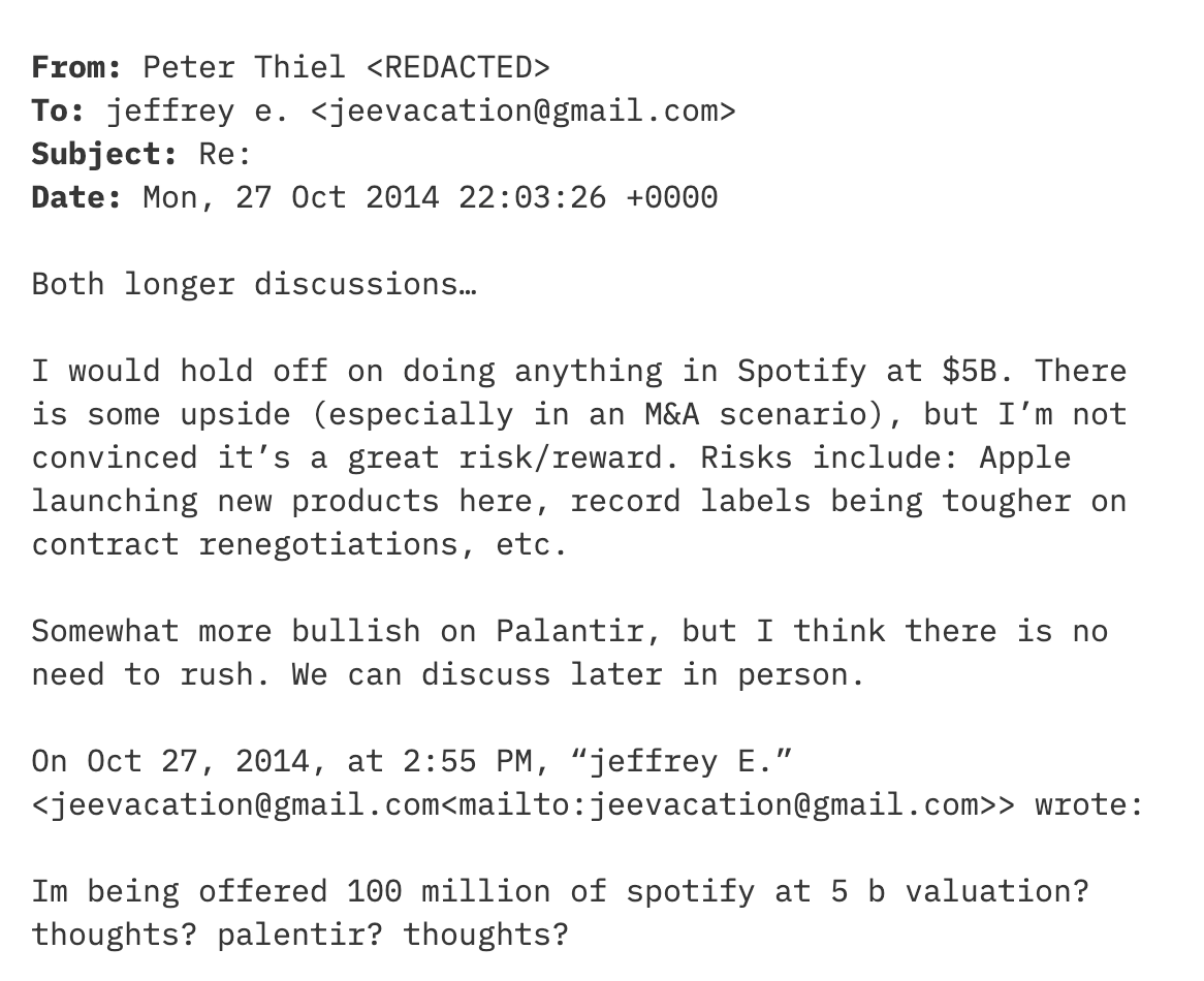 蒂尔在回复邮件中建议爱泼斯坦“暂缓”对Spotify的投资。对于自家公司Palantir,蒂尔则表示,“相对更看好,但认为无需急于行动”。
