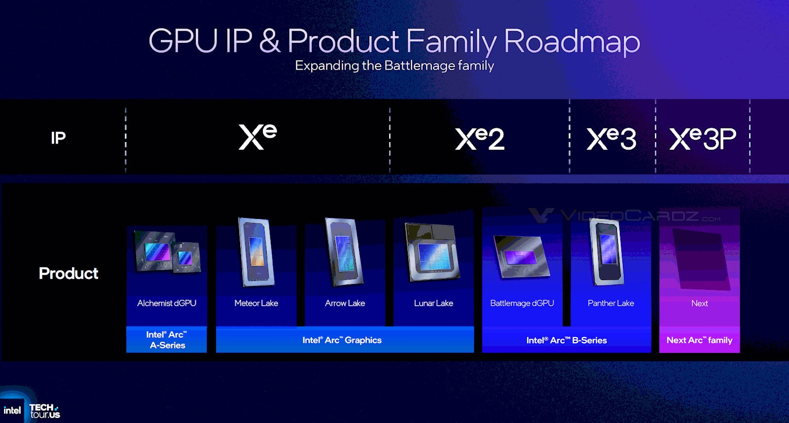 按照Intel最初的规划,四代GPU架构代号分别为Alchemist(炼金术士)、Battlemage(战斗法师)、Celestial(天神)、Druid(德鲁伊), 当时预计分别对应Xe、Xe2、Xe3、Xe4。
