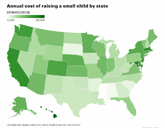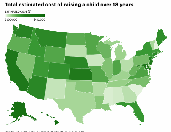 在部分州,育儿相关成本的增速远高于通胀率。研究发现,堪萨斯州与阿拉斯加州的18年预估育儿成本在LendingTree2025至2026年的统计期间暴涨23.5%,蒙大拿州涨幅达21.7%。