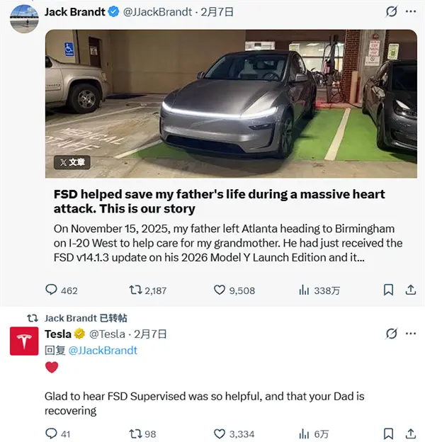 近日,X平台博主Jack Brandt分享了一则特斯拉FSD(完全自动驾驶)“救命”的故事,吸引了众多关注,甚至特斯拉官方都在评论区留言。该事件发生于2025年11月15日凌晨3点,博主的父亲突发剧烈胸痛,意识开始模糊,勉强拨通儿子电话,告知无法继续驾驶。