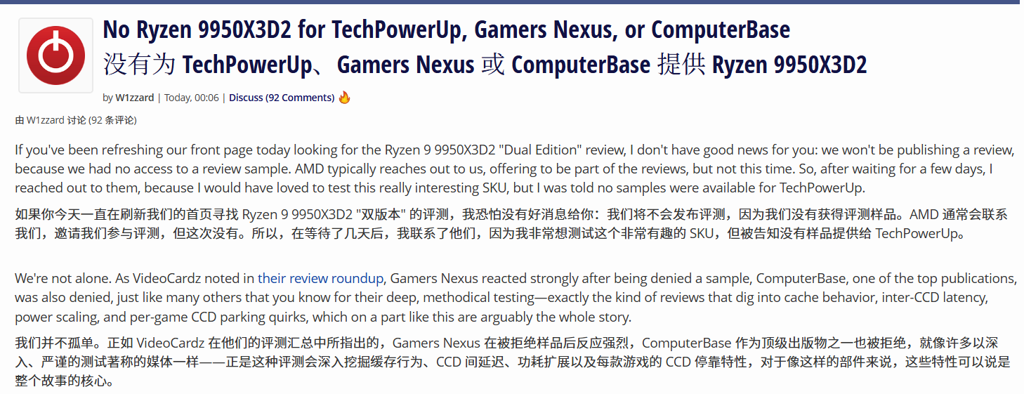 AMD锐龙9 9950X3D2的解禁已经评测,但多家以深度测试著称的硬件媒体却集体缺席,TechPowerUp、Gamers Nexus、ComputerBase均未获得评测。TechPowerUp主编、GPU-Z开发者W1zzard在今日发布的文章中直言,AMD此次的产品分发策略令人难以不将其解读为刻意筛选。