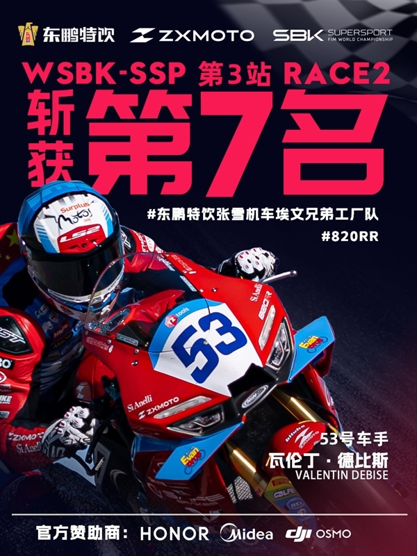 4月19日,2026 年世界超级摩托车锦标赛(WSBK)荷兰站第二回合正赛,因赛事突发红旗提前结束。中国摩托车品牌张雪机车 53 号车手瓦伦丁·德比斯,驾驶 820RR-RS 赛车最终斩获第七名。