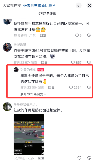 面对评论区部分网友的留言,张雪也真诚回应:“赛车圈还是很干净的,每个人都是为了自己的信仰在拼搏。”