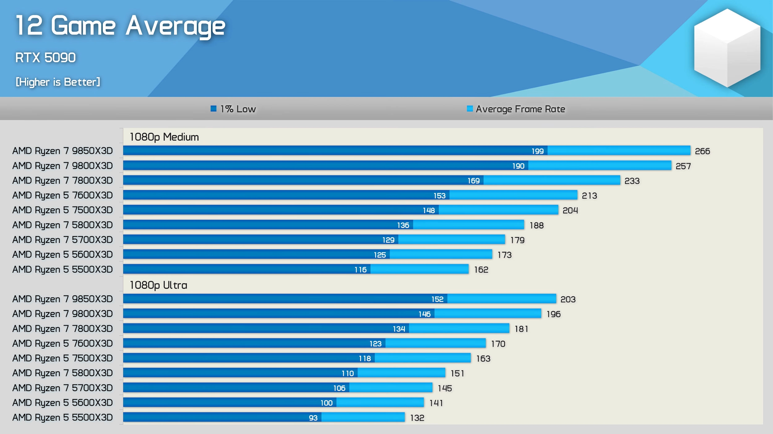 据Hardware Unboxed发布的评测报告,其使用RTX 5090显卡在1080p分辨率下,对AMD锐龙5和锐龙7 X3D处理器进行了12款游戏的平均帧率测试,覆盖Zen 3、Zen 4和Zen 5三代架构。