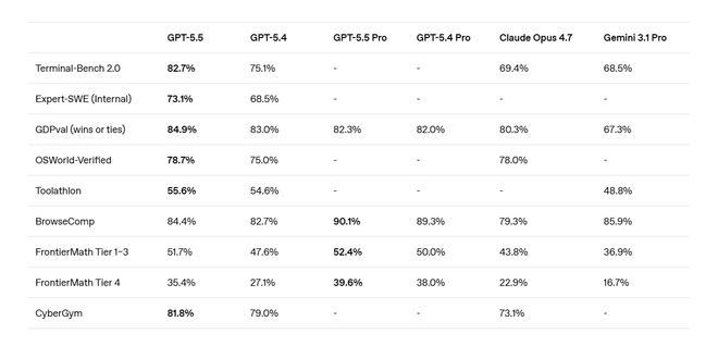 先看数据。GPT-5.5在一系列硬核基准测试中,把上一代GPT-5.4甩在了身后,也压过了竞争对手一头。
