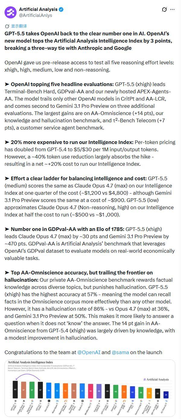 第三方评测机构Artificial Analysis做了全面测试。他们的结论是GPT-5.5让OpenAI重新回到了AI领域的绝对第一,在他们设定的智能指数中领先3分,打破了此前与Anthropic和谷歌三方平局的格局。五大核心评估中,GPT-5.5在Terminal-Bench Hard、GDPval-AA和APEX-Agents-AA中均居榜首。