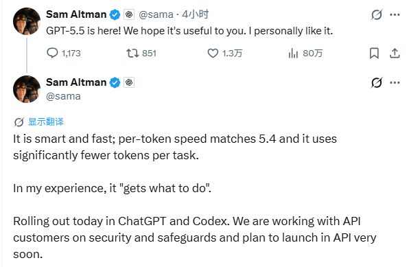 就在今天,这个模型已经上线。对于那些需要处理复杂编码任务、繁琐知识工作或推进科学研究的用户来说,GPT-5.5提供的不只是一个更快的回答工具,而是一个能理解意图、接管流程、持续推动任务往前走的系统。而对于开发者来说,还得再等一等API的正式开放。在人类将越来越复杂的工作交给AI的这条路上,GPT-5.5是一个值得关注的路标。
