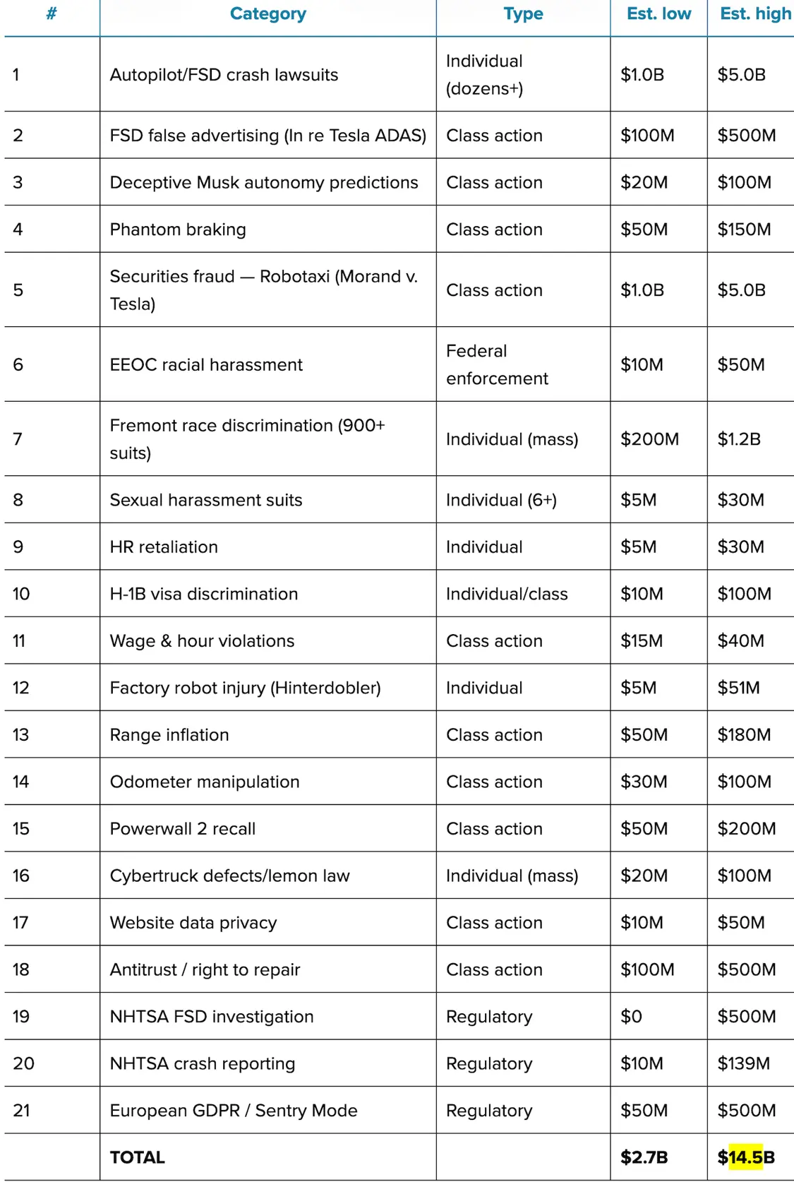 为了理解特斯拉所面临诉讼的严重程度,Electrek针对该公司的每一项重大未决诉讼和监管行动汇总成了一份分析报告。结果令人震惊:特斯拉至少面临21类不同法律诉讼,涵盖七个类别,预估的财务损失从保守的27亿美元到最高的145亿美元不等。