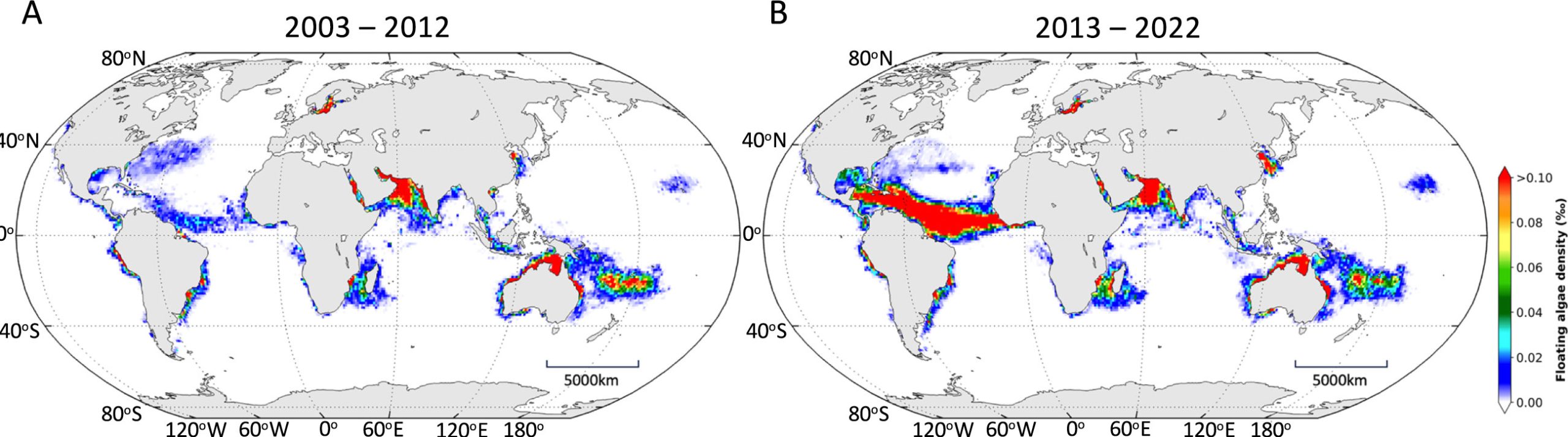 研究利用2003年至2022年的卫星观测数据,发现全球范围内海面微藻薄膜和漂浮宏观藻团都呈增长趋势。统计显示,微藻覆盖面积以每年约1%的速度稳步增加,而宏观藻类在部分海域则呈现远为迅猛的扩张,在热带大西洋和西太平洋地区,其年增幅高达13.4%,尤其在2008年之后增速明显加快。截至研究期末,全球海面微藻暴发区的总面积已达4380万平方公里(约1690万平方英里),明显偏离以往的历史分布格局。研究团队认为,这些数字指向的是一次从“贫宏藻”海洋向“富宏藻”海洋演替的“体制转折”。