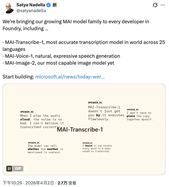 美国科技公司微软周四宣布,3款内部开发的AI模型正式推出广泛商用,展示该公司试图摆脱依赖长期合作伙伴OpenAI的努力。具体来说,微软AI超级智能团队开发的MAI-Transcribe-1、MAI-Voice-1和MAI-Image-2三款模型,涵盖了企业AI中最具商业价值的3项能力——语音转录、语音生成和图像创建。