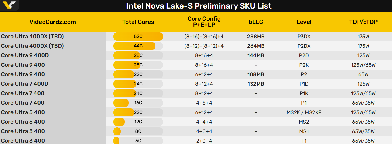 Intel下一代桌面处理器Nova Lake-S将会配备最多288MB bLLC大缓存,首次正面反击AMD X3D系列。根据最新情报,Intel的大缓存版本将会单独命名为酷睿Ultra 400DX、酷睿Ultra 400D系列,以示区别。