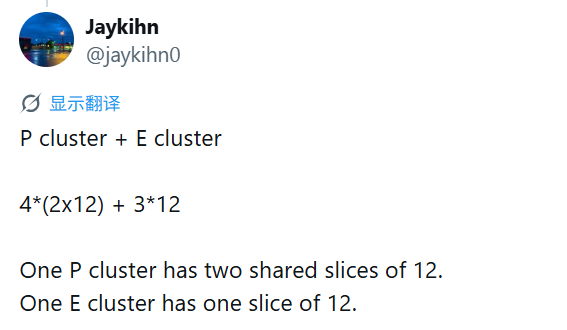 其中,P核每个对应12MB bLLC,E核则还是每4个为一组,共享12MB bLLC。