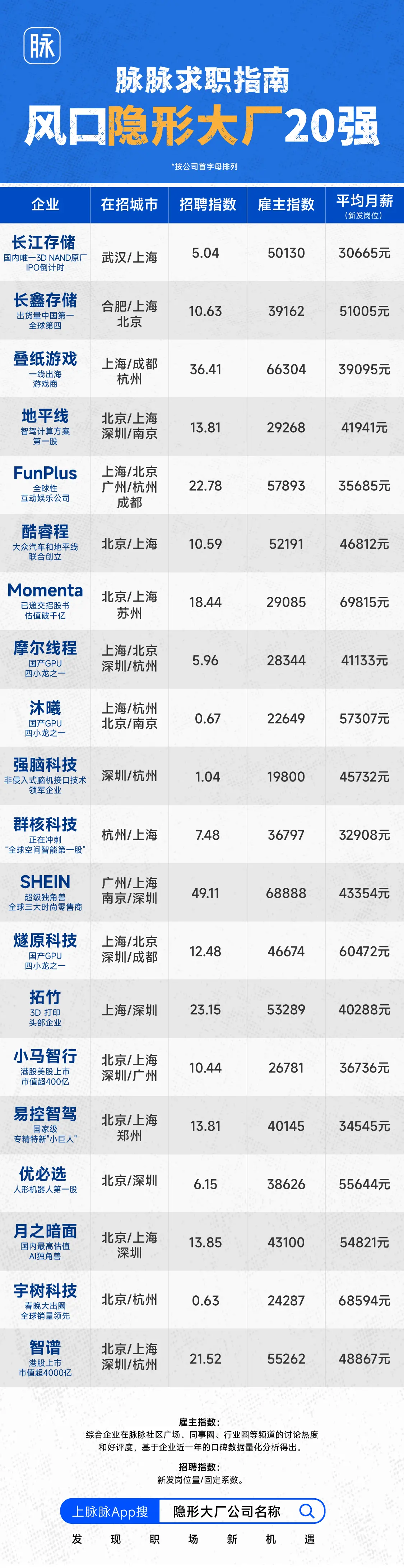 4月9日,昨日,职场社区平台脉脉发布80家“隐形大厂”名单,涵盖智谱、SHEIN、地平线、Momenta、月之暗面、摩尔线程、优必选、宇树科技等企业,涉及AI大模型、智能驾驶、机器人、芯片、跨境电商等赛道。此外,脉脉还从80家企业中进一步筛选出20家高速成长企业形成“隐形大厂20强”。