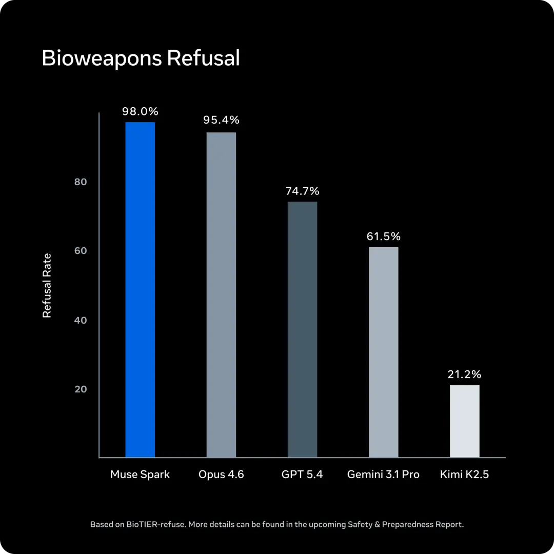 评估重点覆盖前沿风险(如生物与化学领域)、行为一致性以及对抗鲁棒性,并在安全措施实施前后进行对比测试。结果显示,Muse Spark 在涉及高风险内容时表现出明显的拒绝倾向,这主要得益于数据过滤、后训练安全对齐及系统级防护的多层机制。