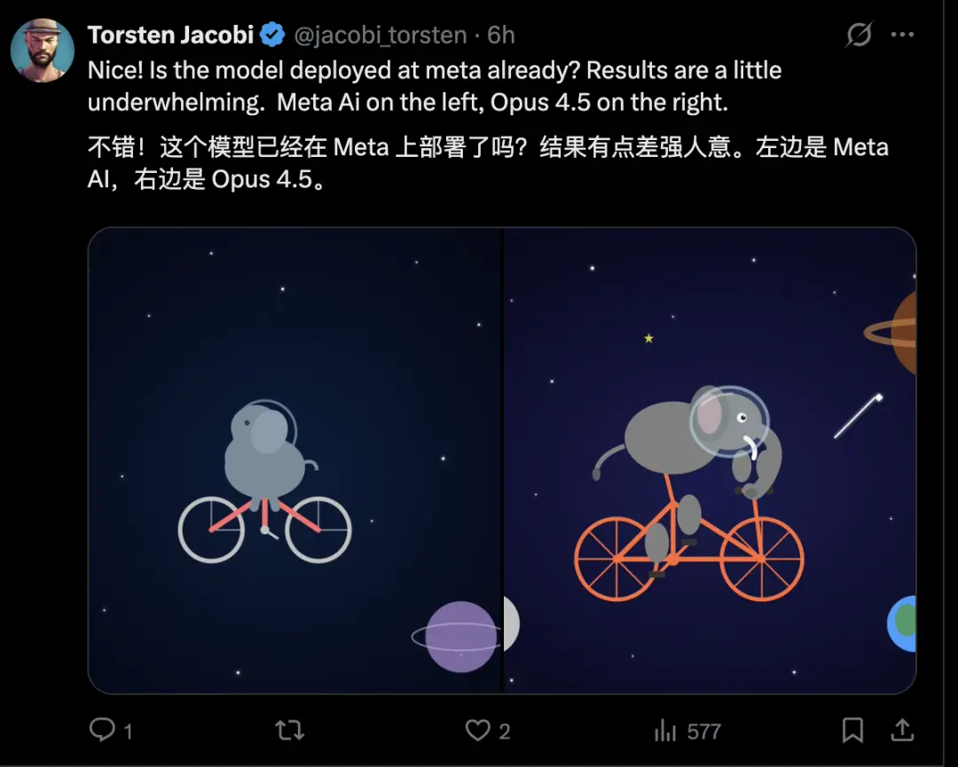 还有网友将 Meta 的新模型与 Opus 4.5 进行了对比,认为“牛油果”表现逊色于 Opus 4.5。