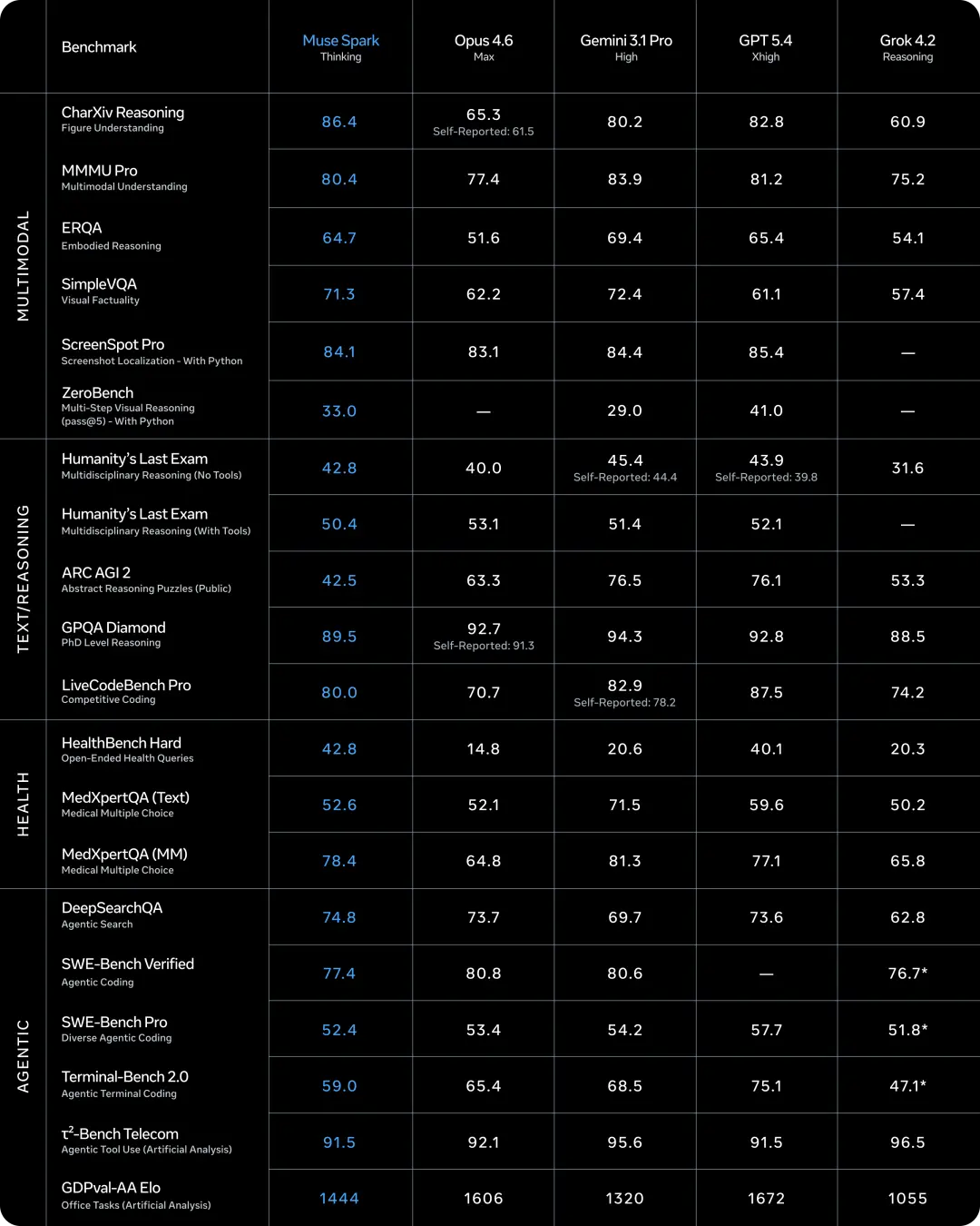 官方披露,在过去九个月中,团队重构了预训练体系,包括模型架构、优化方法和数据管理流程。结果是:在达到相同性能的前提下,Muse Spark 所需的训练计算量(FLOPs)相比上一代模型(如 Llama 4 Maverick)下降了一个数量级以上。