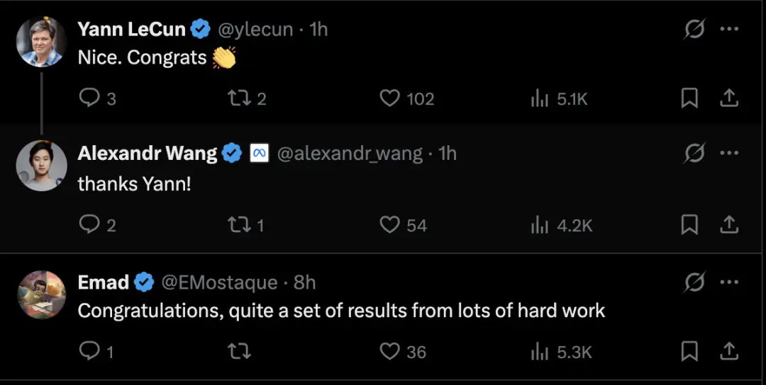 Muse Spark 的发布在技术社区引发了巨大反响 ,Stability AI 创始人 Emad Mostaque 及 Meta 前首席科学家 Yann LeCun、Coinbase 联创兼 CEO Brian Armstrong 等大佬纷纷在 x 上向 Alexandr Wang 和 Meta 表示祝贺。
