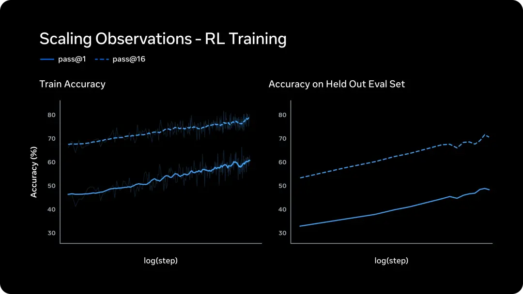 强化学习。经过预训练后,强化学习 (RL) 利用计算能力可扩展地提升模型性能。尽管大规模强化学习历来容易出现不稳定,但 Meta 的新技术栈能够带来平稳、可预测的性能提升。