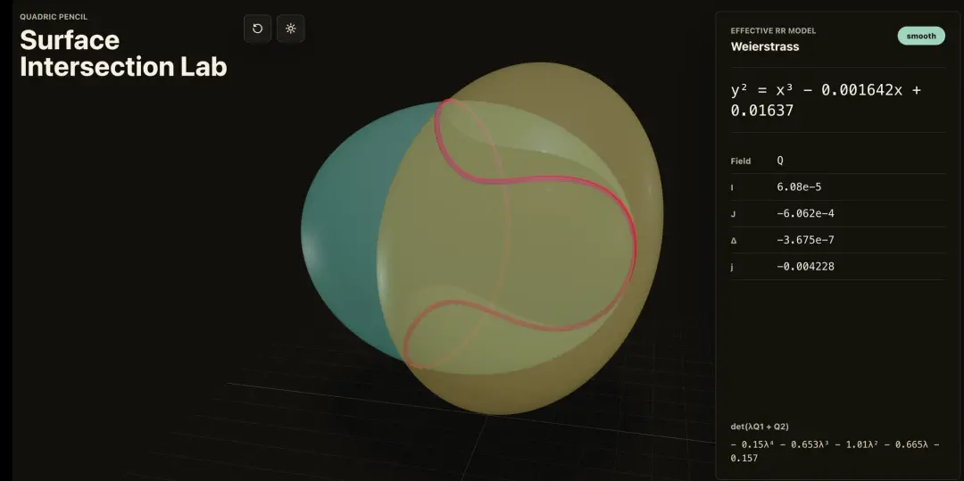 这个应用能画出两个二次曲面的交线,标成红色,还能用Riemann-Roch定理把交线转成Weierstrass曲线的标准形式。后来他又扩展了更稳定的奇点可视化功能。