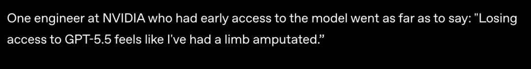 这次奥特曼没有自己站出来说“初体验被吓到眩晕瘫坐,那一刻就像看到原子弹爆炸”了,而是请了一群嘴替(早期测试用户)。其中有一位英伟达工程师,他在早期测试结束后短暂的失去了GPT-5.5的访问权限,然后说了这样一句话: