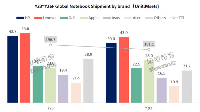 据市场研究机构Sigmaintell预测,到2026年底,苹果将成为全球第三大笔记本电脑厂商,MacBook整体出货量预计将超过传统PC大厂戴尔,进一步提升其在全球笔记本市场中的排名。 按照该机构的测算,2026年联想仍将以4300万台的笔记本销量位居全球第一,惠普以3900万台排名第二,苹果则预计销售2800万台MacBook,较其2025年约2300万台的销量明显增长。